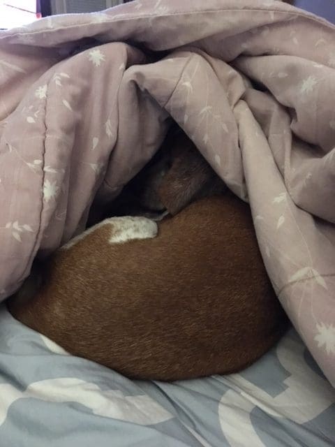 Your vigilance continued even as we went to bed, and you sat on the edge of the mattress, alert and serious as you waited for the next wave. It took several rounds of “find the kibble in the messed up blanket” and a nice, soothing murder show on the TV to relax you enough to burrito under the heaviest quilt available, your shift apparently now over, left to me to carry on.