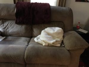 This morning we came downstairs, an hour later than usual but still before anyone else was up, and faced the trashed kitchen and dining room. Normally you’d burrito on the kitchen window seat while I clean, so when I noticed you not there I went looking for you.