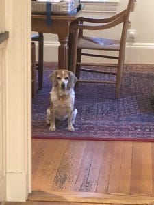 You began the job of sniffing my suitcase, pocketbook and backpack, meticulously inspecting each inch of the pile, and I went to the kitchen to make a cup of tea. I chatted with the renters, took out some cheese and crackers, and when I stepped carefully toward the counter, realized that you were nowhere to be found underfoot, your usual placement cued by the open fridge door.